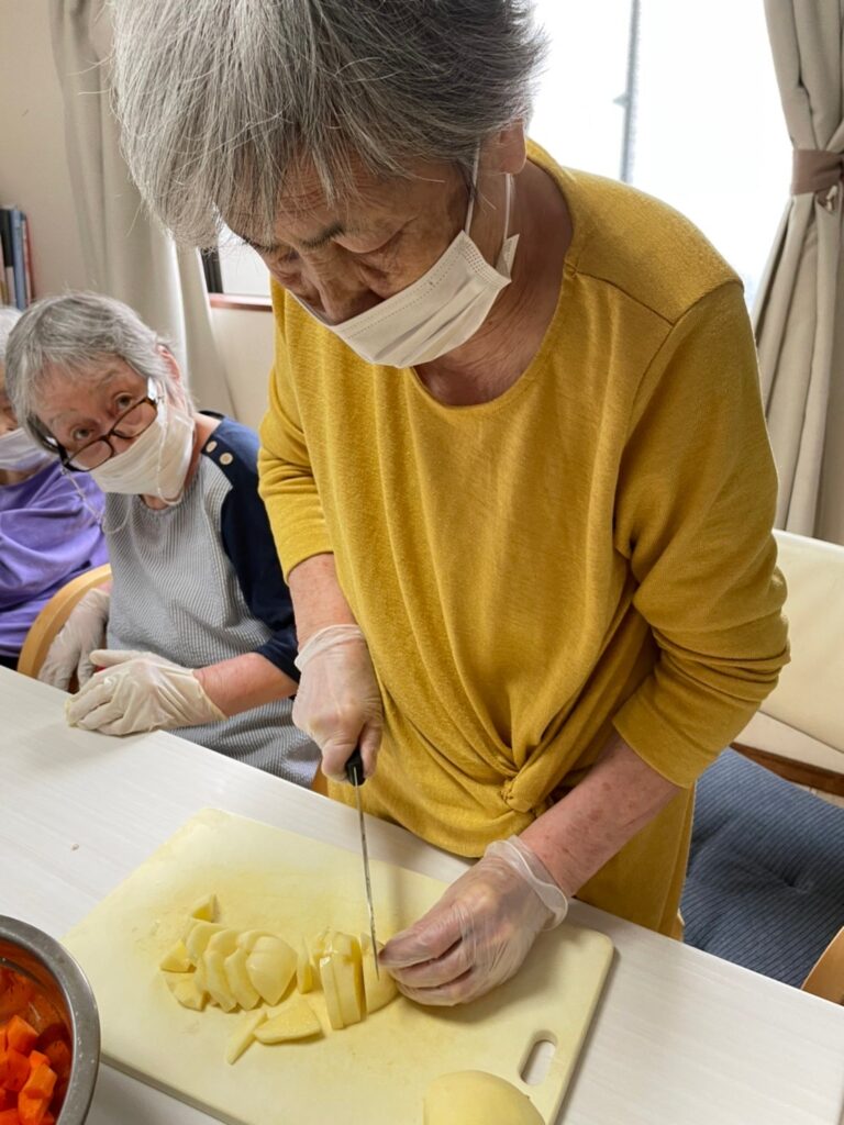 若い女性職員もサポートしながら、ご利用者様に料理を教わっている(笑い)状況ですが