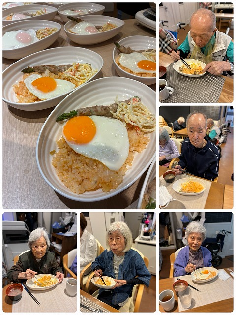 お昼は大好評の食レク!本日は目玉焼きのせボリューム満点ナシゴレン風チャーハン・栄養満点アスパラベーコン巻・コラーゲンたっぷり春雨の鶏がらスープ!豪華満腹コースでみなさまニコニコ笑顔で大喜び♪
