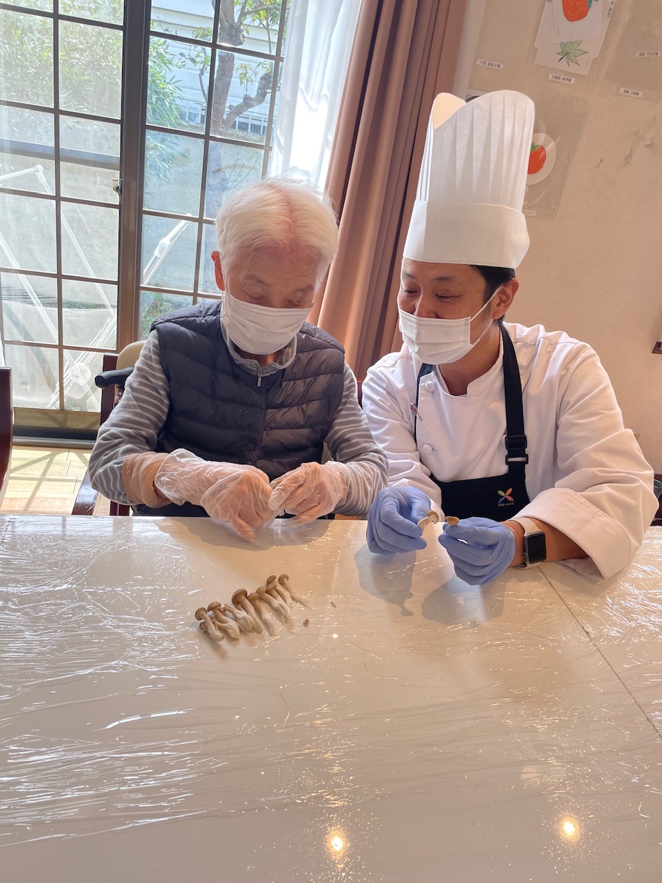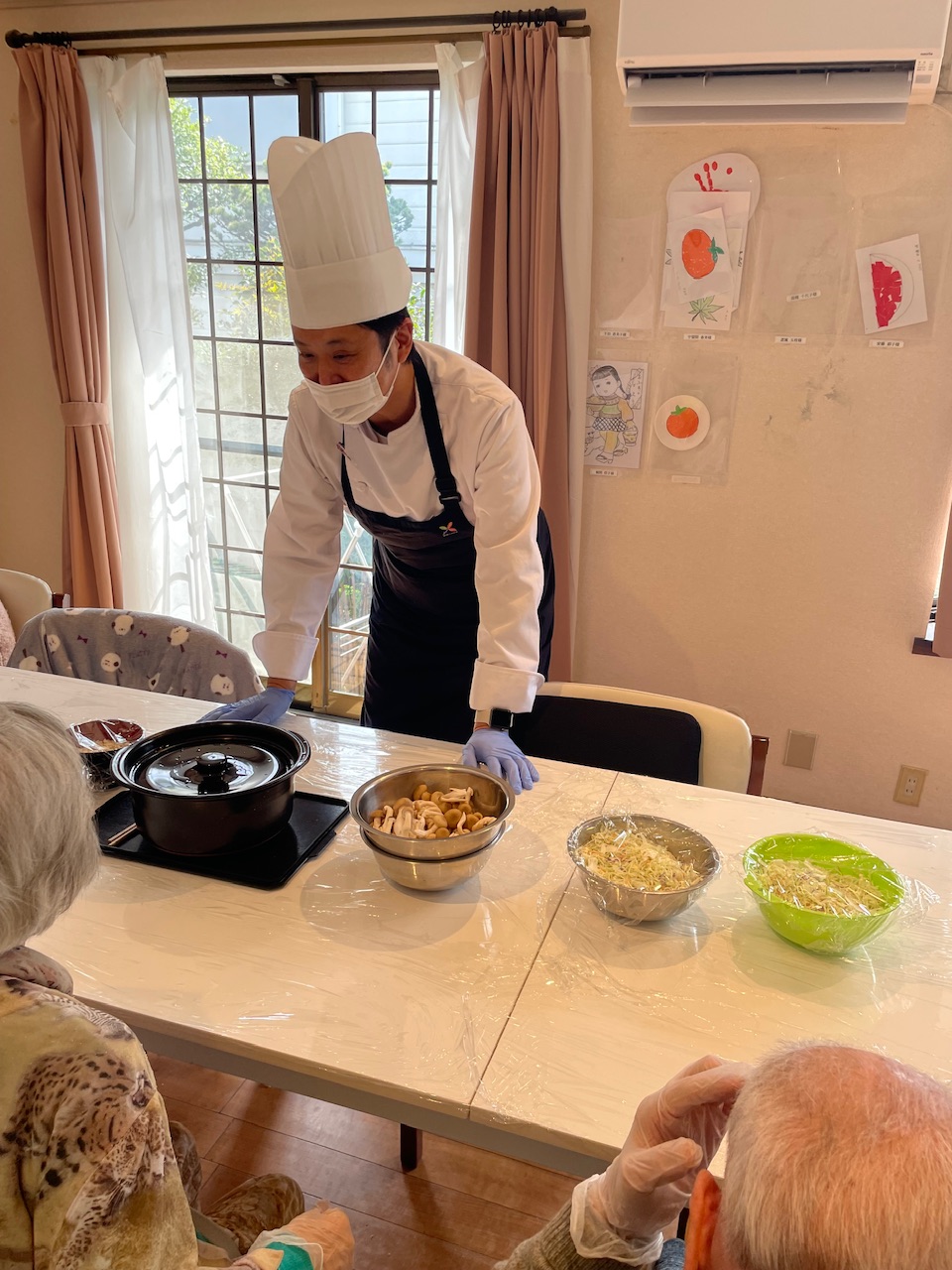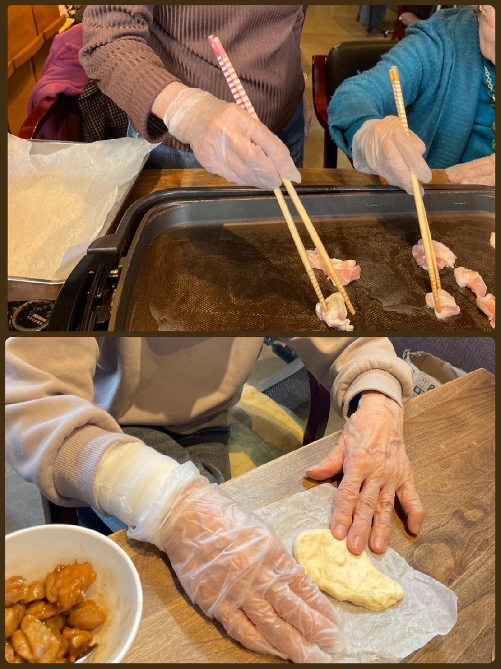 鶏肉にタレを絡めて部屋中美味しい香りがして、皆さんワクワクしながら待ちきれない様子でした。